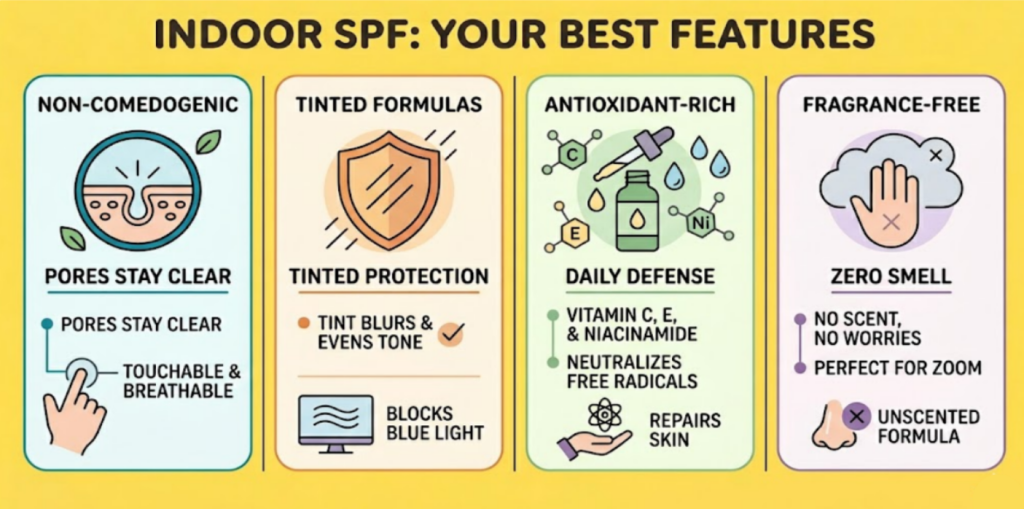 Since you aren’t fighting waves at the beach or sweat during a marathon, your indoor sunscreen criteria should focus on “wearability.” You want a product that feels like a high-end moisturizer rather than a sticky shield. Look for these specific features:
